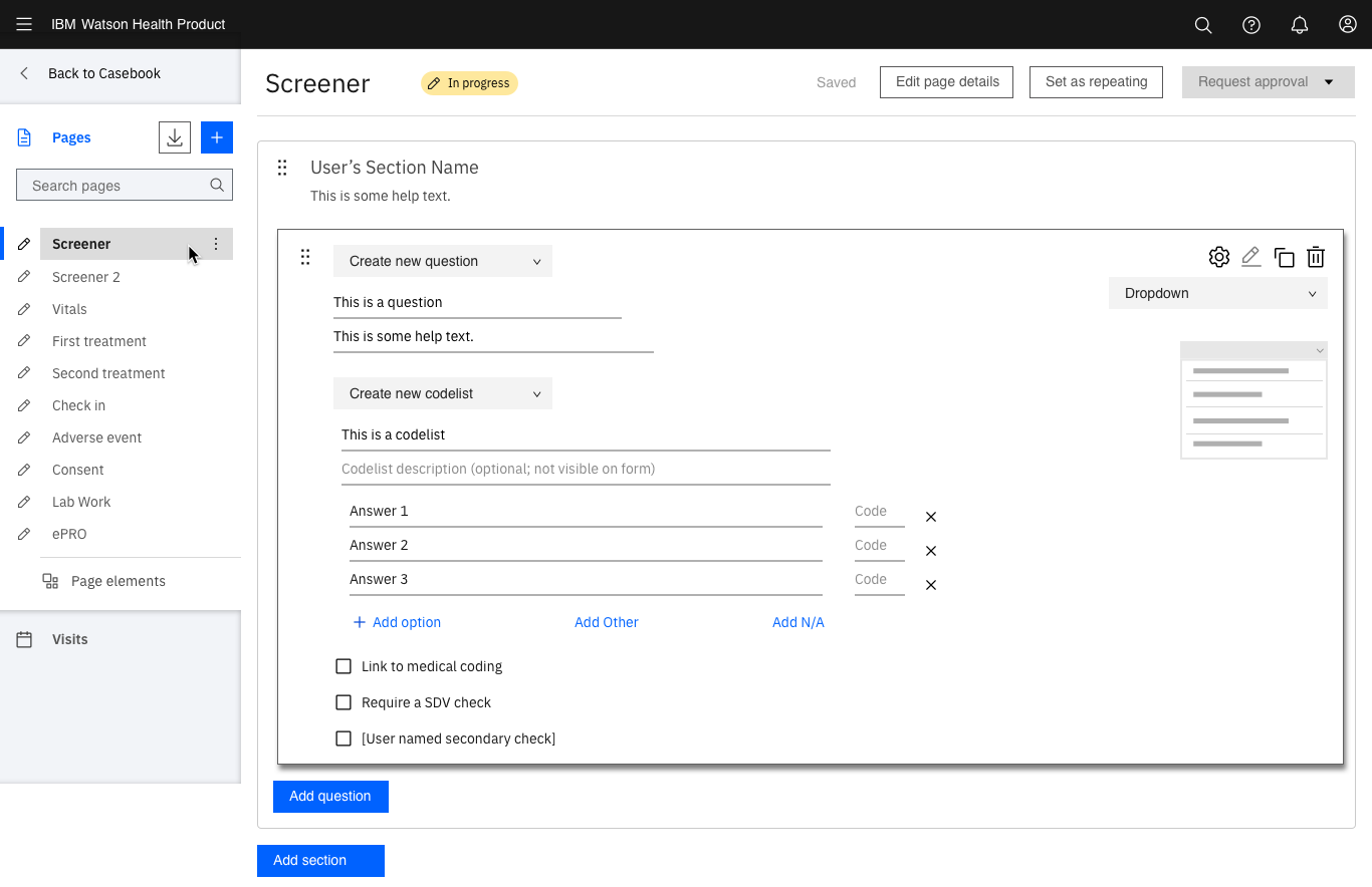 I also spent a significant amount of time building and deploying my own studies. Not only to experience what users did, but to also better understand the system. ICD is a highly customizable tool where everything you see on the study conduct side of the tool is a result of a setting in the study designer side. Beyond the forms for data collection; the navigvation, page titles, and even the iconography were all customizable and differed between studies. In order to truly understand the consquences of an action, I had to track it across both the study design and study conduct sides of the tool.